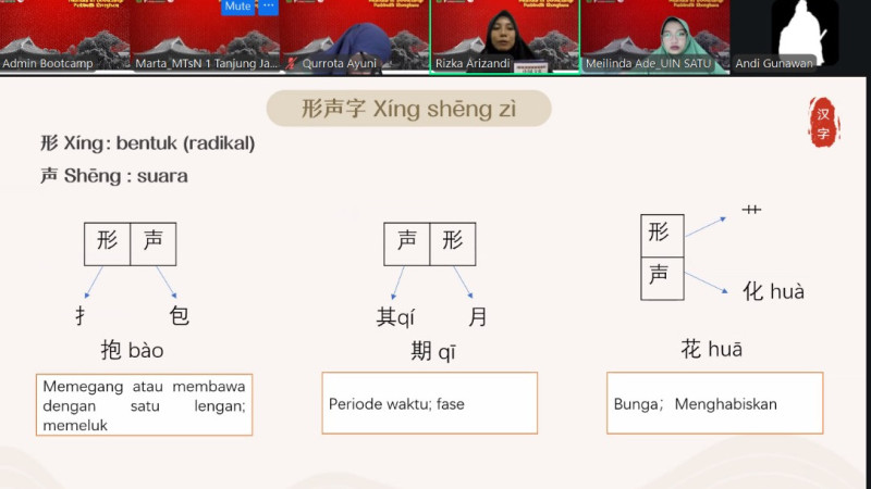 Sebagaimana pertemuan sebelumya, bootcamp pertemuan ke- 7 (tujuh) dipandu oleh Laoshi Vania yang membahas homework dan pendalaman pinyin, sedangkan Laoshi Rizka memandu peserta melafalkan dialog-dialog sesuai materi terkait dan mengenal budaya empat musim di Tiongkok.